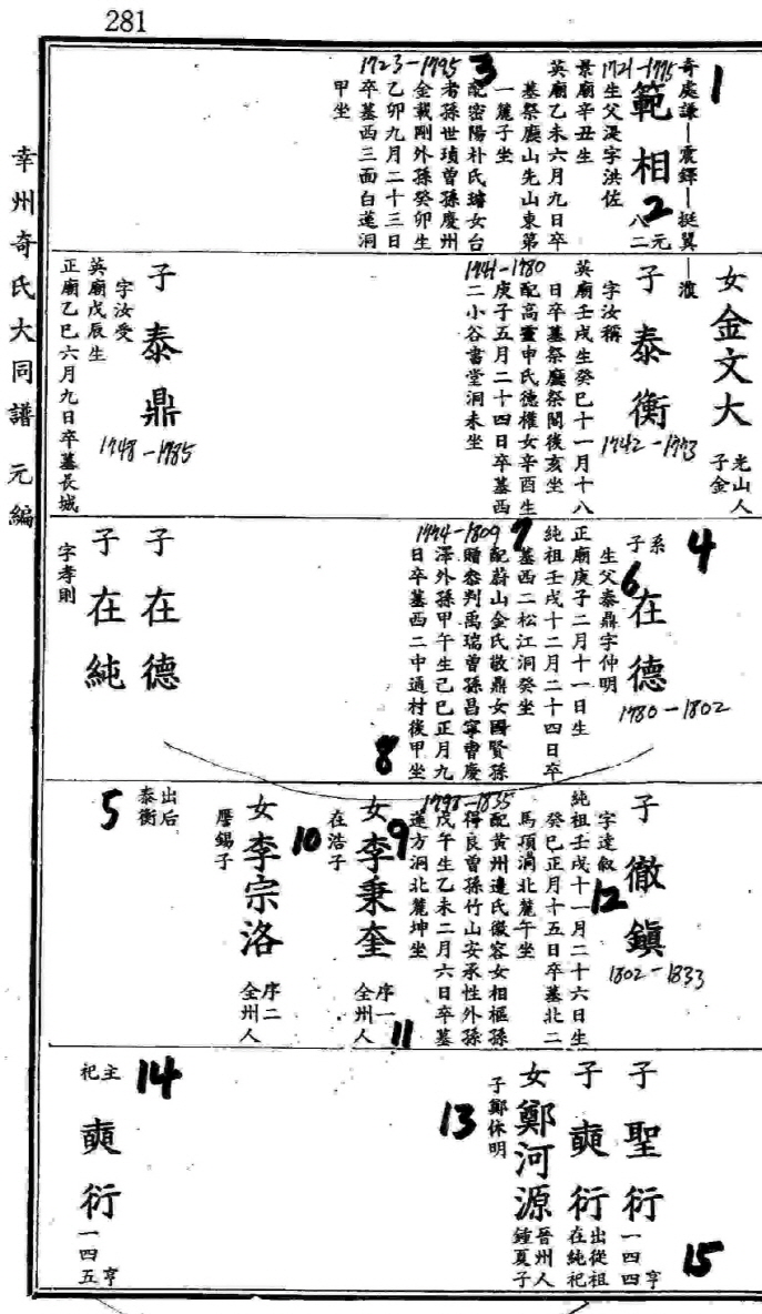 2번에 원82(元八二)라고 나옵니다. 이것은 옆에 있는 4대 조상이 기록된 page을 표시합니다, 쉽게 말해서 여기 나온 기상범공이 몇 page에 가면 윗대를 이어서 볼 수 있는가를 알려주는 것입니다 이곳은 원편 281page이고요, 윗대를 이어서 보려면 원편 82page를 펼쳐 보시면 됩니다. 15번에는 형144(亨一四四)라고 되어있습니다. 이것은 형편 144page에 가면 계속 이어진 후손들에 대한 기록을 볼 수 있다는 뜻입니다.