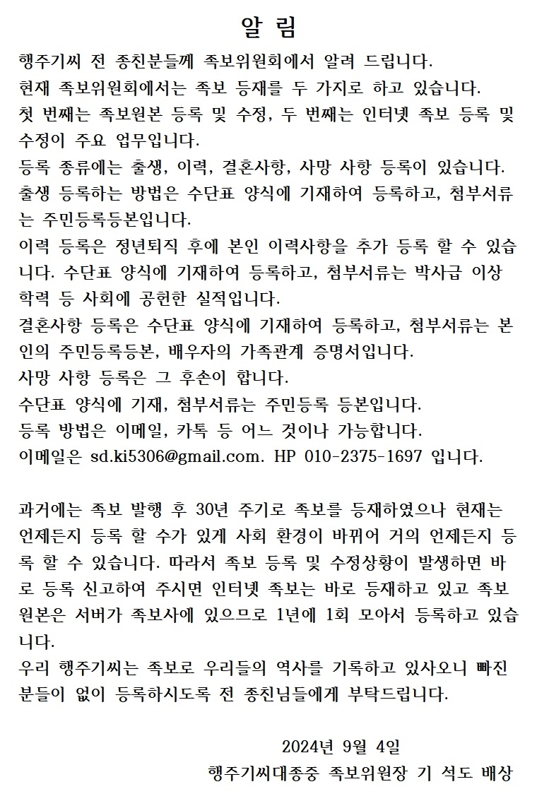 새로운 등록은 대종중에 구성된 족보위원회를 통하여 해주십시요.